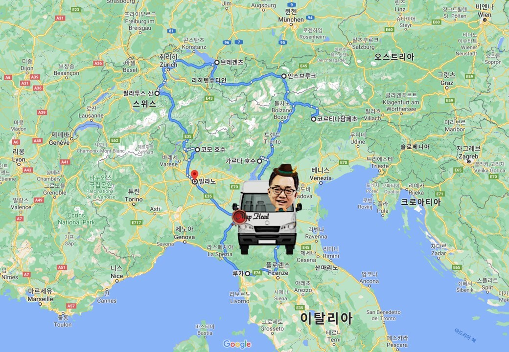 프라하 → 칼리슈테 → 이흘라바 → 체스키크룸로프 → 잘츠부르크 → 할슈타트 → 퓌센 → 브리겐츠 → 인스부르크 → 볼자노 → 오르티지아 → 파쏘포르도이 → 밀라노